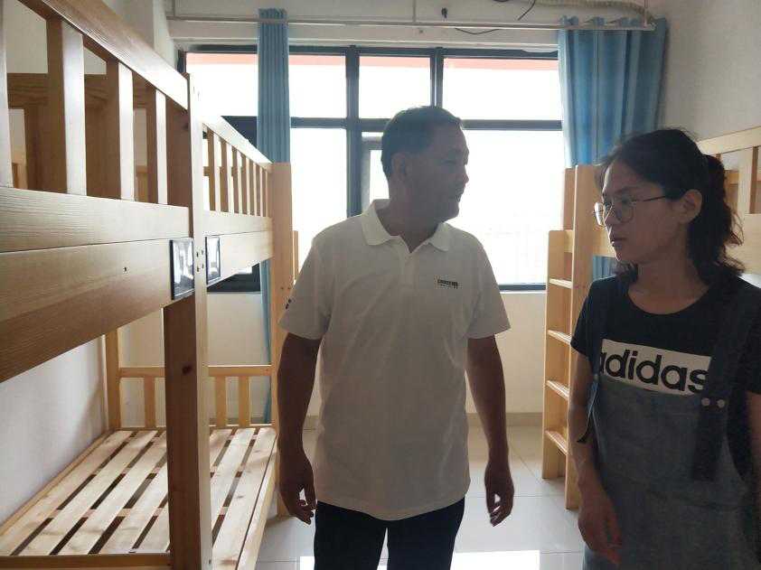 张爱平董事长与检查小组一行来到学生公寓,并要求有关负责人要加强监管,充分发挥学校安保措施的积极作用,保证校园的安全稳定,保障学生正常的学习、生活环境。